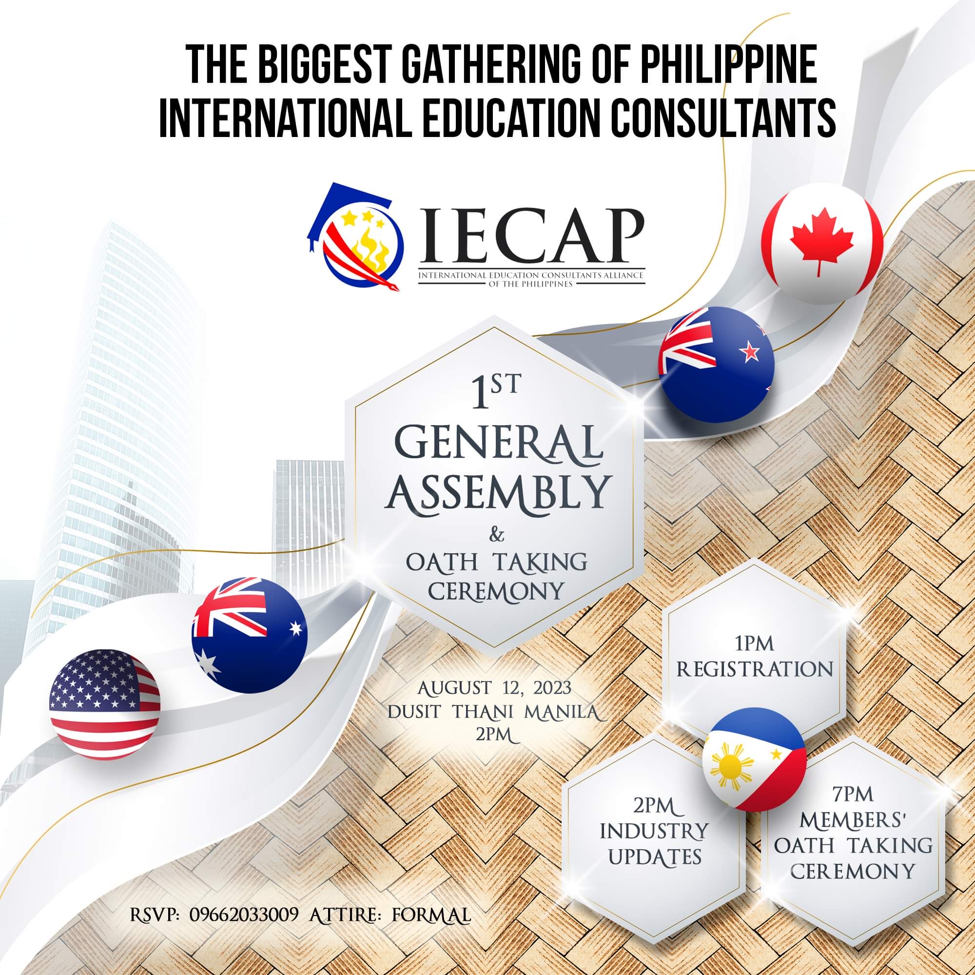 Makati City, Metro Manila, 12 August 2023 — International Education Consultants Alliance of the Philippines or IECAP, a pioneering organization dedicated to helping Filipinos pursue quality international education in various countries, is set to have its upcoming general assembly and induction of officers at Hotel Dusit on 12 August 2023. The event aims to make official IECAP’s commitment to empowering individuals to pursue transformative international educational experiences that will enrich their lives and the lives of their families.
